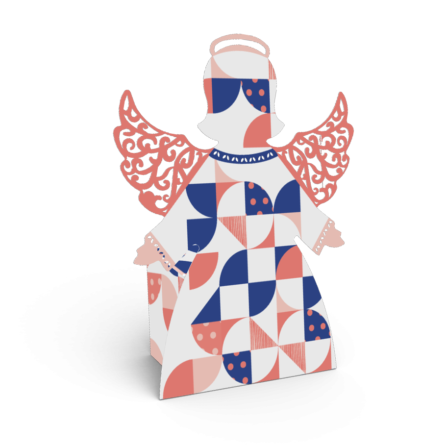 Geschenkverpackung von engelhaft filigraner BrillanzEngel – als traditionelles Symbol des Friedens und der Harmonie – dürfen in der besinnlichen Advents- und Weihnachtszeit keineswegs fehlen. Unsere Geschenkverpackung mit ansprechend designtem Dekorblatt in Form eines Engels bietet dabei nicht nur den passenden Rahmen für Weihnachtsgeschenke der besonderen Art. Die Geschenkbox „Engel“ Deluxe perfektioniert auch optisch als stilvolles Deko-Accessoire jede Weihnachtstafel. Die feinen und filigranen Ausstanzungen veredeln das Dekorblatt auf außergewöhnlich beflügelnde Weise und verleihen der Geschenkverpackung einen Hauch Luxus. Ob klassisches Weihnachts-Motiv, Logo, Foto oder Botschaft – in puncto individuelle Gestaltung sind deiner Kreativität keinerlei Grenzen gesetzt. Gestalte deine ganz persönliche Weihnachts-Geschenkbox.